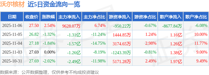 证券之星消息,截至2025年11月6日收盘,沃尔核材(002130)报收于27.5元,上涨2.54%,换手率4.55%,成交量52.12万手,成交额14.28亿元。