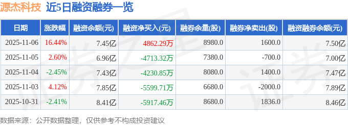 源杰科技融资融券信息显示,融资方面,当日融资买入3.7亿元,融资偿还3.21亿元,融资净买入4862.29万元。融券方面,融券卖出1600.0股,融券偿还0.0股,融券余量8980.0股,融券余额553.64万元。融资融券余额7.5亿元。