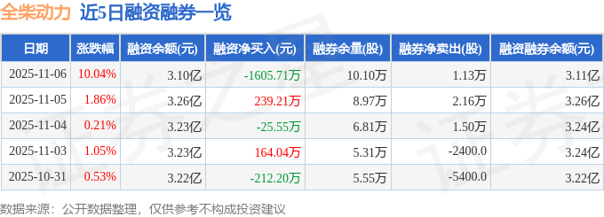 证券之星消息,截至2025年11月6日收盘,全柴动力(600218)报收于10.85元,上涨10.04%,涨停,换手率7.13%,成交量31.07万手,成交额3.32亿元。