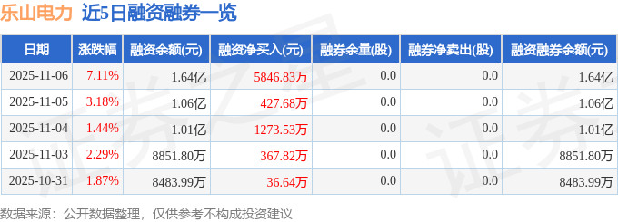 乐山电力融资融券信息显示,融资方面,当日融资买入1.27亿元,融资偿还6876.04万元,融资净买入5846.83万元,连续3日净买入累计7548.03万元。融券方面,融券卖出0.0股,融券偿还0.0股,融券余量0.0股,融券余额0.0万元。融资融券余额1.64亿元。