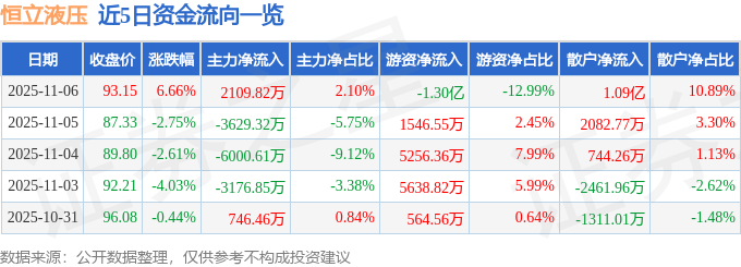 证券之星消息,截至2025年11月6日收盘,恒立液压(601100)报收于93.15元,上涨6.66%,换手率0.82%,成交量11.0万手,成交额10.04亿元。
