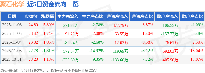 证券之星消息,截至2025年11月6日收盘,聚石化学(688669)报收于24.8元,上涨5.89%,换手率3.29%,成交量4.0万手,成交额9757.31万元。
