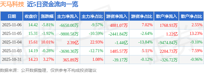 证券之星消息,截至2025年11月6日收盘,天马科技(603668)报收于14.42元,下跌5.81%,换手率9.5%,成交量47.83万手,成交额6.95亿元。