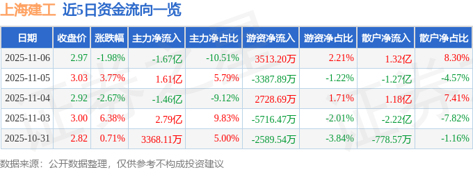 证券之星消息,截至2025年11月6日收盘,上海建工(600170)报收于2.97元,下跌1.98%,换手率6.03%,成交量536.26万手,成交额15.91亿元。