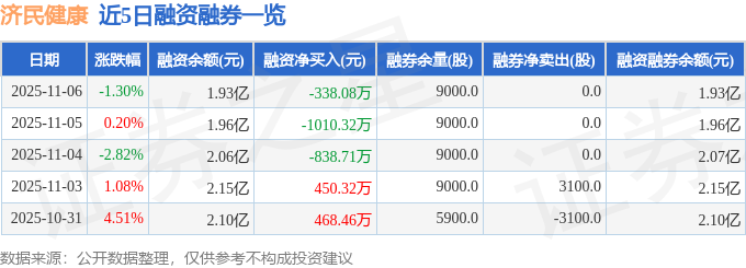 济民健康融资融券信息显示,融资方面,当日融资买入2459.11万元,融资偿还2797.2万元,融资净偿还338.08万元。融券方面,融券卖出0.0股,融券偿还0.0股,融券余量9000.0股,融券余额8.91万元。融资融券余额1.93亿元。