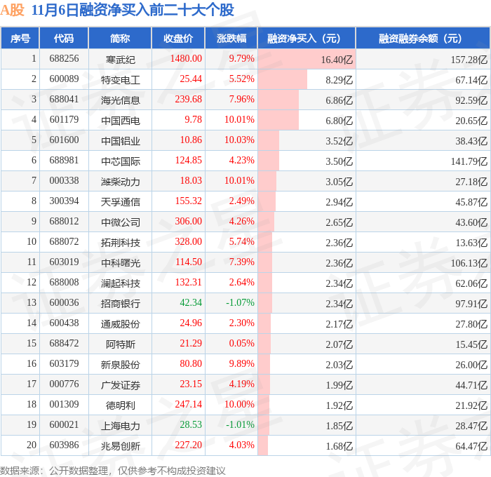 A股融资净买入前三分别为:寒武纪(688256)融资净买入16.4亿元、特变电工(600089)融资净买入8.29亿元、海光信息(688041)融资净买入6.86亿元,前20具体见下表: