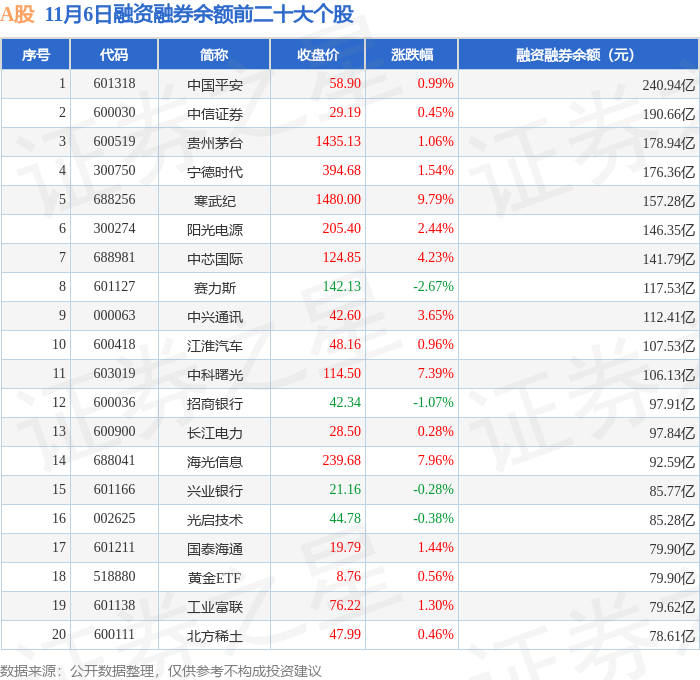 A股融资融券余额前三分别为:中国平安(601318)融资融券余额240.94亿元、中信证券(600030)融资融券余额190.66亿元、贵州茅台(600519)融资融券余额178.94亿元,前20具体见下表: