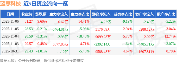 证券之星消息,截至2025年11月6日收盘,蓝思科技(300433)报收于31.27元,上涨9.6%,换手率3.02%,成交量149.99万手,成交额45.96亿元。
