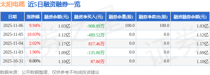 太阳电缆融资融券信息显示,融资方面,当日融资买入3361.76万元,融资偿还4270.64万元,融资净偿还908.89万元。融券方面,融券卖出100.0股,融券偿还0.0股,融券余量100.0股,融券余额0.08万元。融资融券余额1.03亿元。
