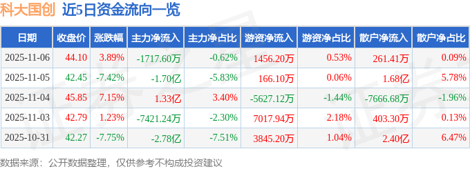 证券之星消息,截至2025年11月6日收盘,科大国创(300520)报收于44.1元,上涨3.89%,换手率22.89%,成交量63.64万手,成交额27.59亿元。