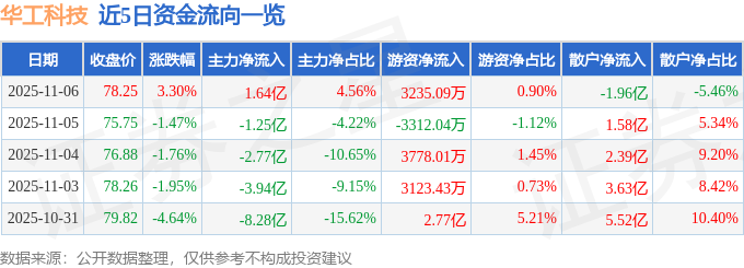 11月6日的资金流向数据方面,主力资金净流入1.64亿元,占总成交额4.56%,游资资金净流入3235.09万元,占总成交额0.9%,散户资金净流出1.96亿元,占总成交额5.46%。