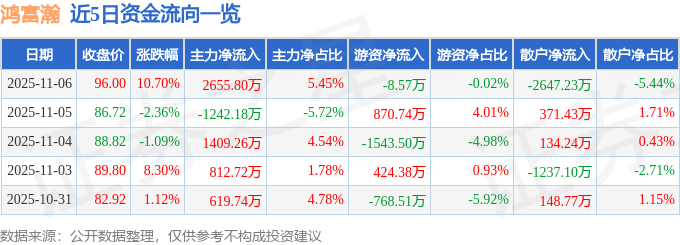 证券之星消息,截至2025年11月6日收盘,鸿富瀚(301086)报收于96.0元,上涨10.7%,换手率11.13%,成交量5.27万手,成交额4.87亿元。