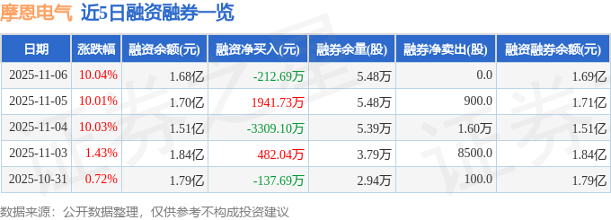 摩恩电气融资融券信息显示,融资方面,当日融资买入0.0万元,融资偿还212.69万元,融资净偿还212.69万元。融券方面,融券卖出0.0股,融券偿还0.0股,融券余量5.48万股,融券余额51.68万元。融资融券余额1.69亿元。