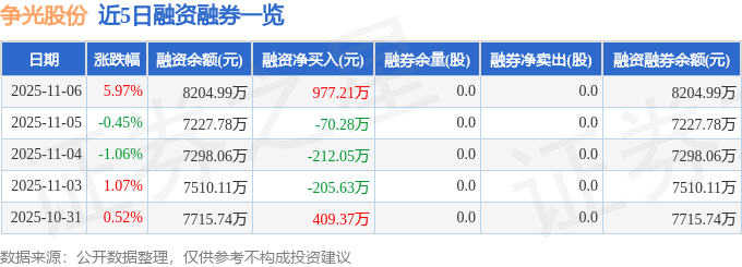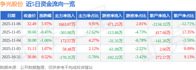 证券之星消息,截至2025年11月6日收盘,争光股份(301092)报收于32.49元,上涨5.97%,换手率8.55%,成交量5.19万手,成交额1.68亿元。