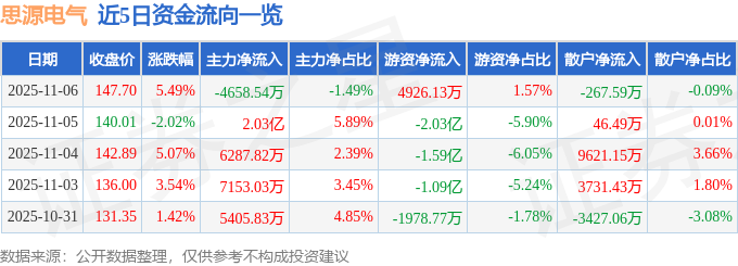 证券之星消息,截至2025年11月6日收盘,思源电气(002028)报收于147.7元,上涨5.49%,换手率3.52%,成交量21.46万手,成交额31.33亿元。
