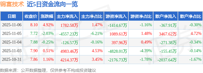 证券之星消息,截至2025年11月6日收盘,锦富技术(300128)报收于8.1元,上涨4.92%,换手率11.78%,成交量152.83万手,成交额12.15亿元。