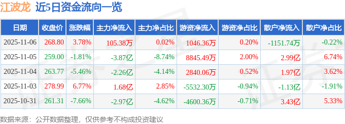 11月6日的资金流向数据方面,主力资金净流入105.38万元,占总成交额0.02%,游资资金净流入1046.36万元,占总成交额0.2%,散户资金净流出1151.74万元,占总成交额0.22%。