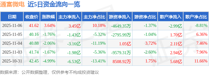 证券之星消息,截至2025年11月6日收盘,通富微电(002156)报收于41.62元,上涨3.64%,换手率5.44%,成交量82.5万手,成交额33.92亿元。