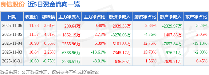 证券之星消息,截至2025年11月6日收盘,良信股份(002706)报收于11.78元,上涨3.61%,换手率6.79%,成交量62.14万手,成交额7.19亿元。