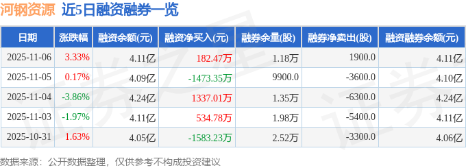 河钢资源融资融券信息显示,融资方面,当日融资买入3496.79万元,融资偿还3314.32万元,融资净买入182.47万元。融券方面,融券卖出2400.0股,融券偿还500.0股,融券余量1.18万股,融券余额21.58万元。融资融券余额4.11亿元。