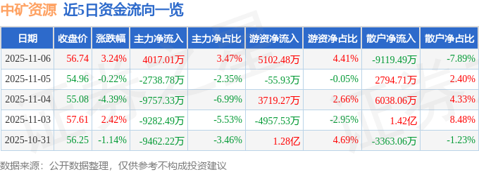证券之星消息,截至2025年11月6日收盘,中矿资源(002738)报收于56.74元,上涨3.24%,换手率2.88%,成交量20.48万手,成交额11.57亿元。