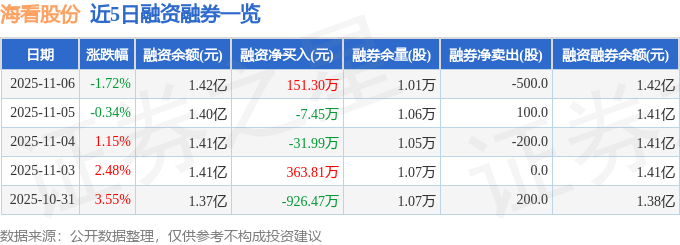 海看股份融资融券信息显示,融资方面,当日融资买入2569.59万元,融资偿还2418.29万元,融资净买入151.3万元。融券方面,融券卖出100.0股,融券偿还600.0股,融券余量1.01万股,融券余额26.02万元。融资融券余额1.42亿元。