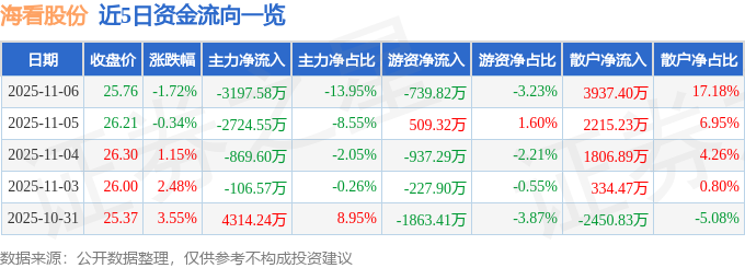 证券之星消息,截至2025年11月6日收盘,海看股份(301262)报收于25.76元,下跌1.72%,换手率7.3%,成交量8.91万手,成交额2.29亿元。