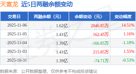 证券之星消息,11月6日,天富龙(603406)融资买入4642.88万元,融资偿还2596.03万元,融资净买入2046.85万元,融资余额1.62亿元。
