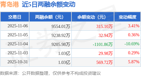 证券之星消息,11月6日,青岛港(601298)融资买入1517.82万元,融资偿还1203.0万元,融资净买入314.82万元,融资余额9546.38万元。