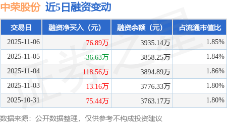 证券之星消息,11月6日,中荣股份(301223)融资买入399.57万元,融资偿还322.68万元,融资净买入76.89万元,融资余额3935.14万元,近20个交易日中有12个交易日出现融资净买入。