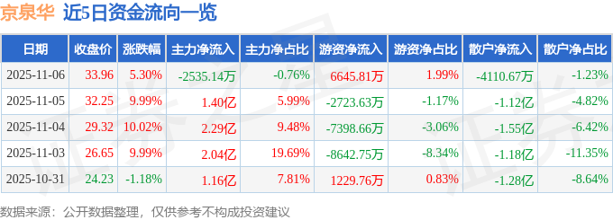11月6日的资金流向数据方面,主力资金净流出2535.14万元,占总成交额0.76%,游资资金净流入6645.81万元,占总成交额1.99%,散户资金净流出4110.67万元,占总成交额1.23%。