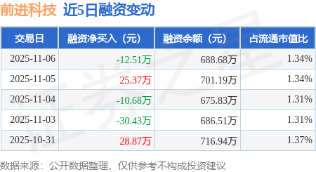 证券之星消息,11月6日,前进科技(920679)融资买入19.06万元,融资偿还31.57万元,融资净卖出12.51万元,融资余额688.68万元,近20个交易日中有11个交易日出现融资净买入。