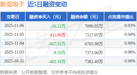 证券之星消息,11月6日,新亚电子(605277)融资买入759.71万元,融资偿还785.93万元,融资净卖出26.22万元,融资余额7090.85万元。