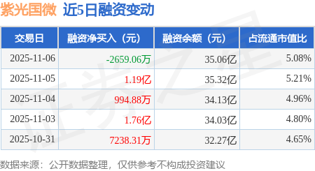 证券之星消息,11月6日,紫光国微(002049)融资买入3.15亿元,融资偿还3.42亿元,融资净卖出2659.06万元,融资余额35.06亿元,近20个交易日中有14个交易日出现融资净买入。