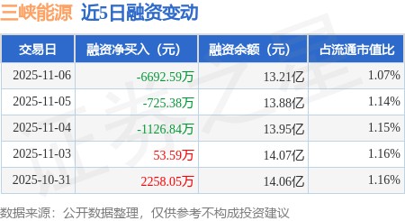 证券之星消息,11月6日,三峡能源(600905)融资买入6975.06万元,融资偿还1.37亿元,融资净卖出6692.59万元,融资余额13.21亿元。