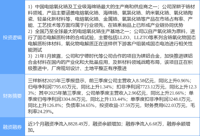 该股为有色 · 锆,固态电池,宁德时代概念股概念热股,当日有色 · 锆概念上涨2.51%,固态电池概念上涨1.99%,宁德时代概念股概念上涨1.47%。