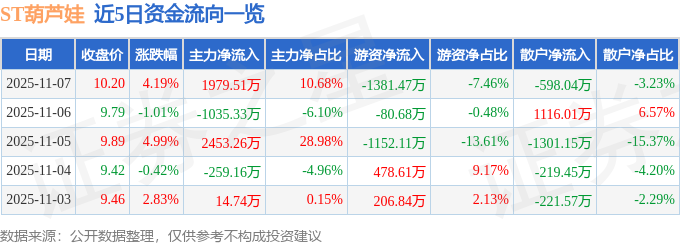 证券之星消息,截至2025年11月7日收盘,ST葫芦娃(605199)报收于10.2元,上涨4.19%,换手率4.58%,成交量18.32万手,成交额1.85亿元。