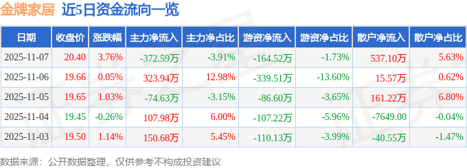 证券之星消息,截至2025年11月7日收盘,金牌家居(603180)报收于20.4元,上涨3.76%,换手率3.06%,成交量4.72万手,成交额9532.14万元。