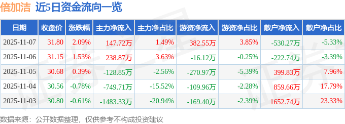 证券之星消息,截至2025年11月7日收盘,倍加洁(603059)报收于31.8元,上涨2.09%,换手率3.13%,成交量3.15万手,成交额9940.08万元。