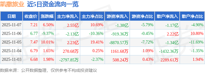 证券之星消息,截至2025年11月7日收盘,凯撒旅业(000796)报收于7.21元,上涨6.5%,换手率24.73%,成交量329.06万手,成交额23.84亿元。