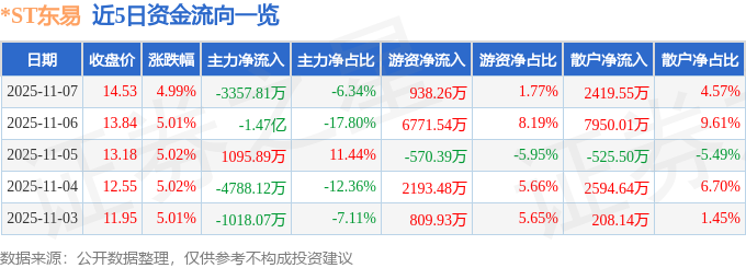 证券之星消息,截至2025年11月7日收盘,*ST东易(002713)报收于14.53元,上涨4.99%,换手率9.0%,成交量37.02万手,成交额5.3亿元。