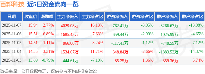 证券之星消息,截至2025年11月7日收盘,百邦科技(300736)报收于15.94元,上涨2.77%,换手率12.66%,成交量15.84万手,成交额2.5亿元。