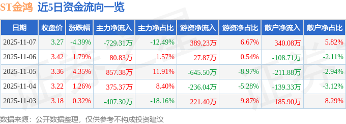 证券之星消息,截至2025年11月7日收盘,ST金鸿(000669)报收于3.27元,下跌4.39%,换手率2.62%,成交量17.8万手,成交额5838.86万元。
