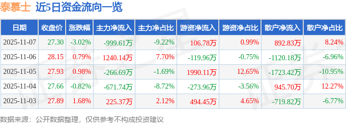 证券之星消息,截至2025年11月7日收盘,泰慕士(001234)报收于27.3元,下跌3.02%,换手率4.3%,成交量3.94万手,成交额1.08亿元。