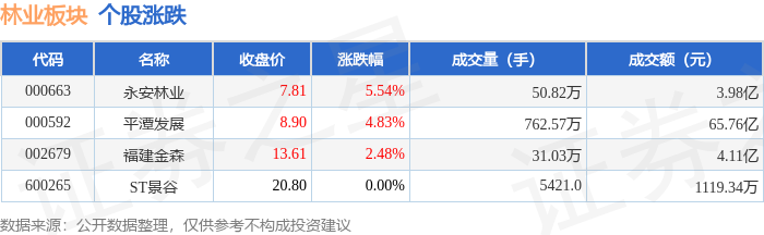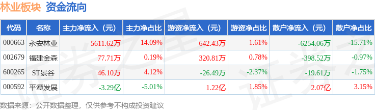 从资金流向上来看,当日林业板块主力资金净流出2.72亿元,游资资金净流入1.31亿元,散户资金净流入1.41亿元。林业板块个股资金流向见下表: