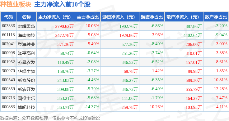 从资金流向上来看,当日种植业板块主力资金净流出1.39亿元,游资资金净流出247.28万元,散户资金净流入1.41亿元。种植业板块个股资金流向见下表: