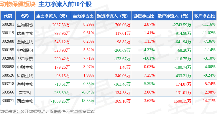 从资金流向上来看,当日动物保健板块主力资金净流出514.4万元,游资资金净流入1620.92万元,散户资金净流出1106.52万元。动物保健板块个股资金流向见下表: