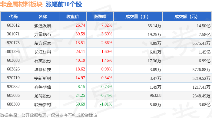 证券之星消息,11月7日非金属材料板块较上一交易日上涨2.05%,索通发展领涨。当日上证指数报收于3997.56,下跌0.25%。深证成指报收于13404.06,下跌0.36%。非金属材料板块个股涨跌见下表: