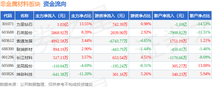 从资金流向上来看,当日非金属材料板块主力资金净流入2.18亿元,游资资金净流出3645.81万元,散户资金净流出1.82亿元。非金属材料板块个股资金流向见下表: