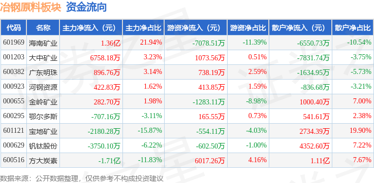 从资金流向上来看,当日冶钢原料板块主力资金净流出1756.29万元,游资资金净流出1109.8万元,散户资金净流入2866.09万元。冶钢原料板块个股资金流向见下表: